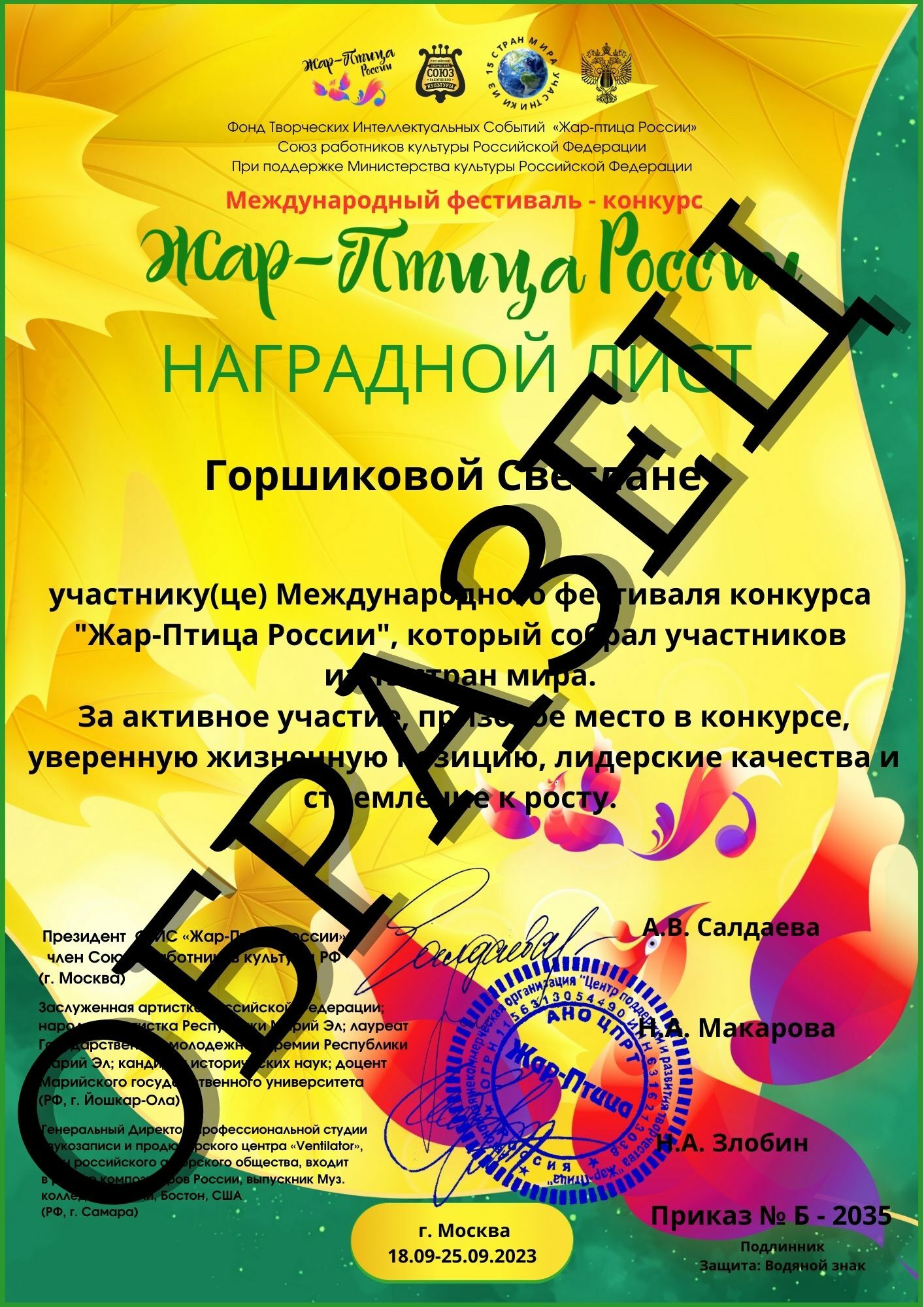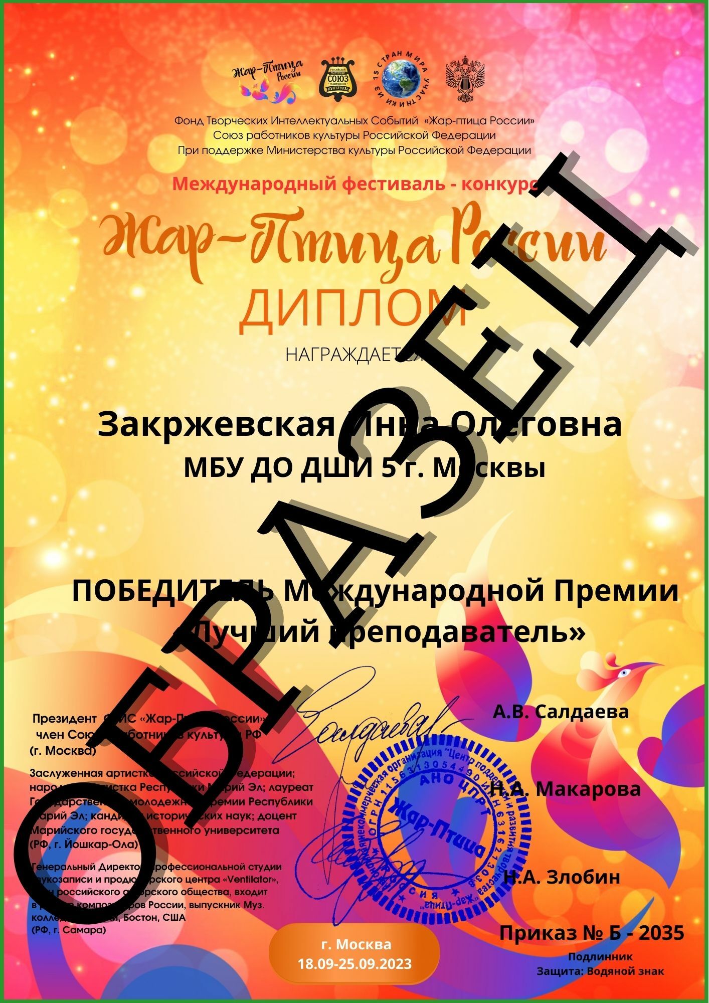 Вы можете выбрать на память о прохождении конкурса: - Диплом участника (с занятым местом из Итоговой таблицы с результатами) - Диплом "Именной для участника коллектива" - Диплом Лучший педагог - Диплом Лучший концертмейстер - Наградное письмо - Благодарность педагогу - Сертификат о прохождении курсов повышения квалификации